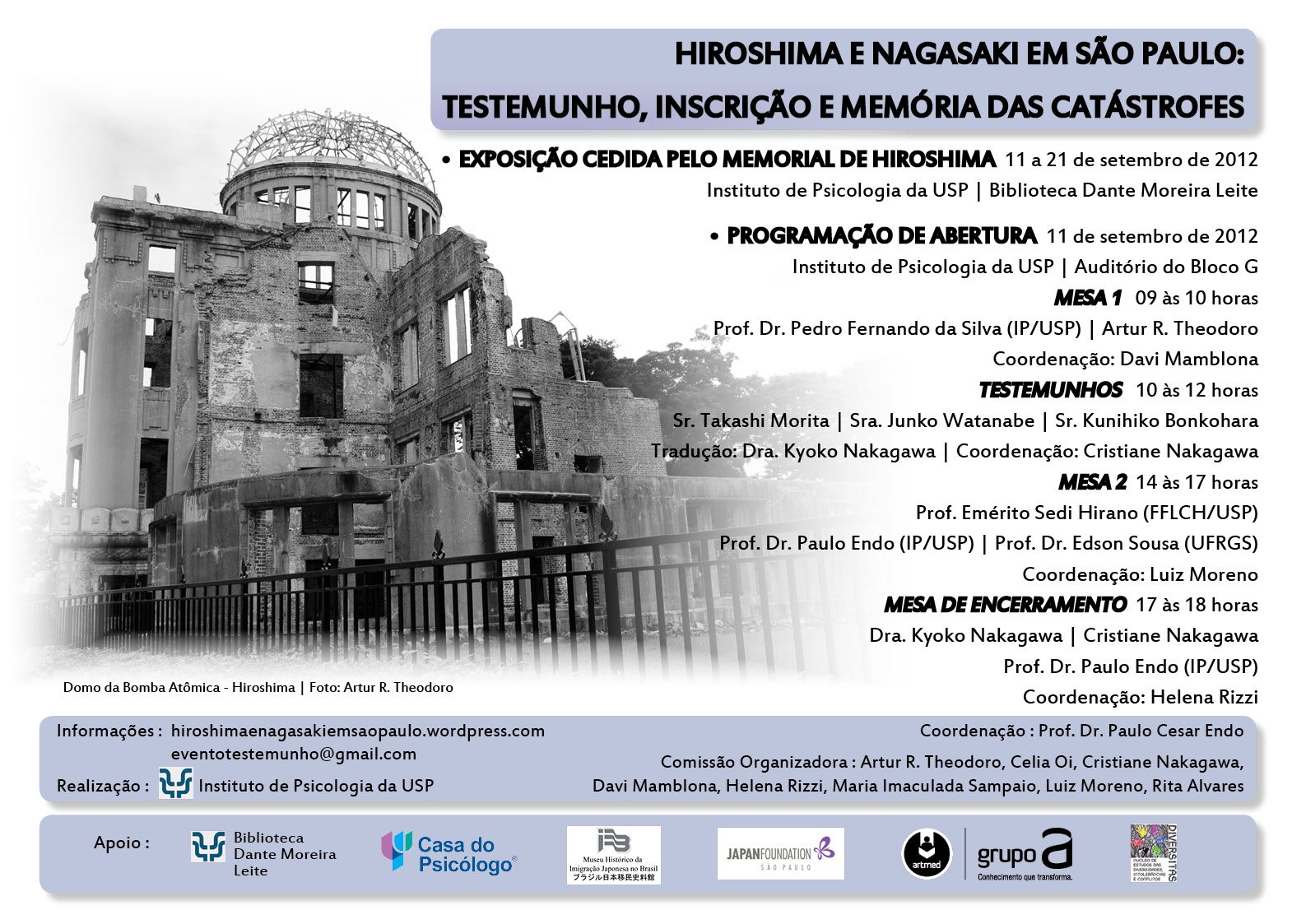 Ocorrerá a partir do dia 11 de setembro ocorrerá o evento “Hiroshima e Nagasaki em São Paulo: Testemunho, inscrição e memória das catástrofes” onde ocorrerá exposição sobre o tema, testemunho oral de sobreviventes e mesas redondas compostas por pesquisadores no assunto.