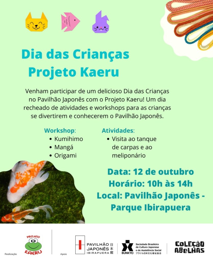 Venha participar do Dias das Crianças com o Projeto Kaeru, que acontece no próximo dia 12 de outubro, no Pavilhão Japonês, no Parque Ibirapuera.